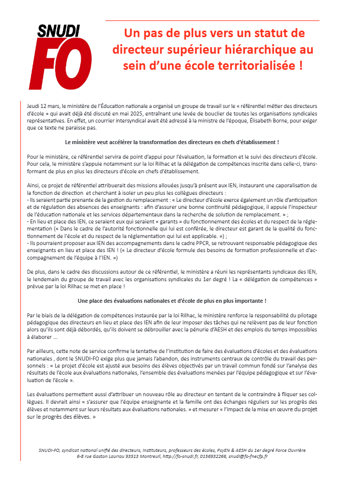 Un pas de plus vers un statut de directeur supérieur hiérarchique au sein d’une école territorialisée ! mars 24, 2026 snudi32 Communiqués nationaux